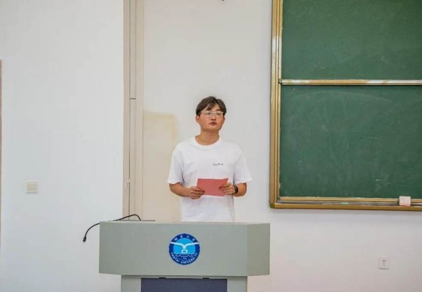 在校生代表李光耀同学在发言中分享了他的研途感悟与成长心得。他提倡同学们通过加强学习来抵御初入实验室因缺乏理论与实验经验产生的迷茫情绪;研究生阶段需重视积累、落实行动,要积极参与志愿活动,主动承接班级、院内工作;新时代研究生珍惜差异、互学互鉴,关注现实需求、将论文写在祖国大地,鼓励新同学以“守信、求实、好学、力行”的校训和“理工融合、稳健奔放”的院训为指引,在烟大沃土追梦成长。