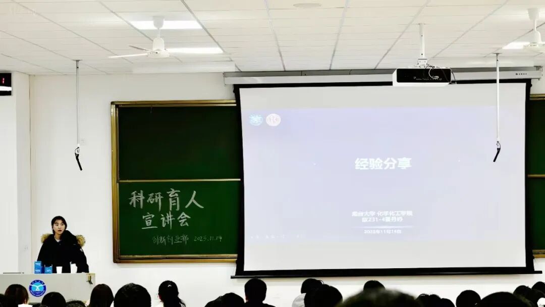 为激发化学化工学院学生科创热情,营造浓厚的科创文化氛围,助力学生提升创新实践能力,11月14日,化学化工学院在二教101教室开展科研育人宣讲会。本次活动由团委创新创业部承办。
