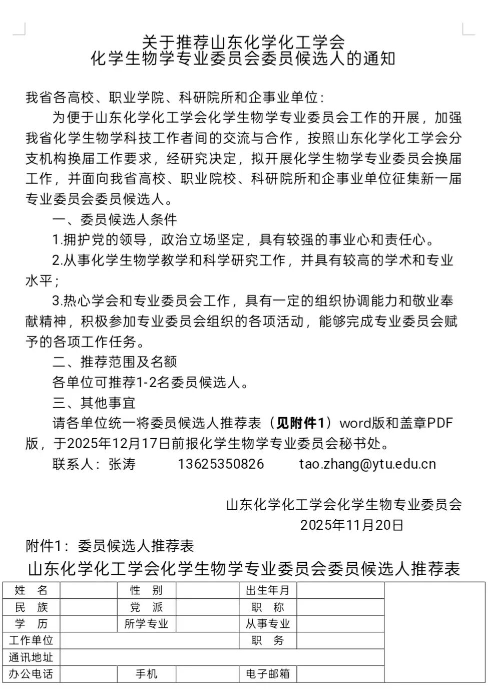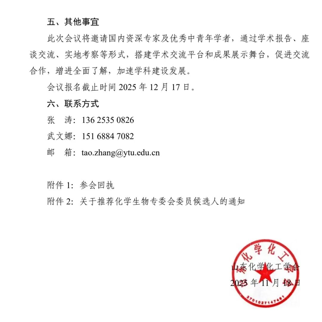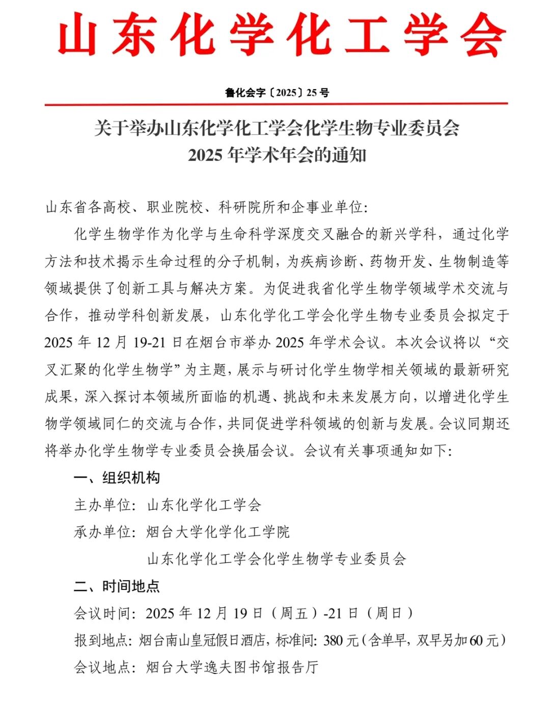 关于举办山东化学化工学会化学生物专业委员会2025年学术年会的通知