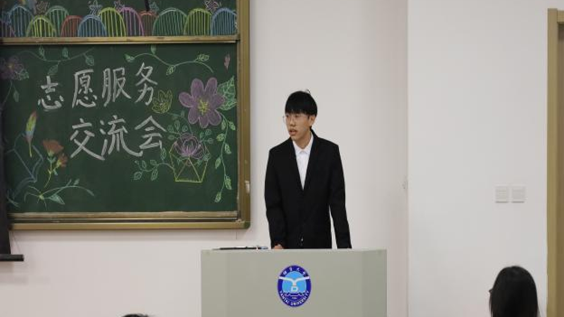 随着主持人清亮的开场声落,志愿服务交流会正式拉开帷幕。志愿服务部部长王语情首先登台,宣读了本次参与答辩的个人及团支部名单。