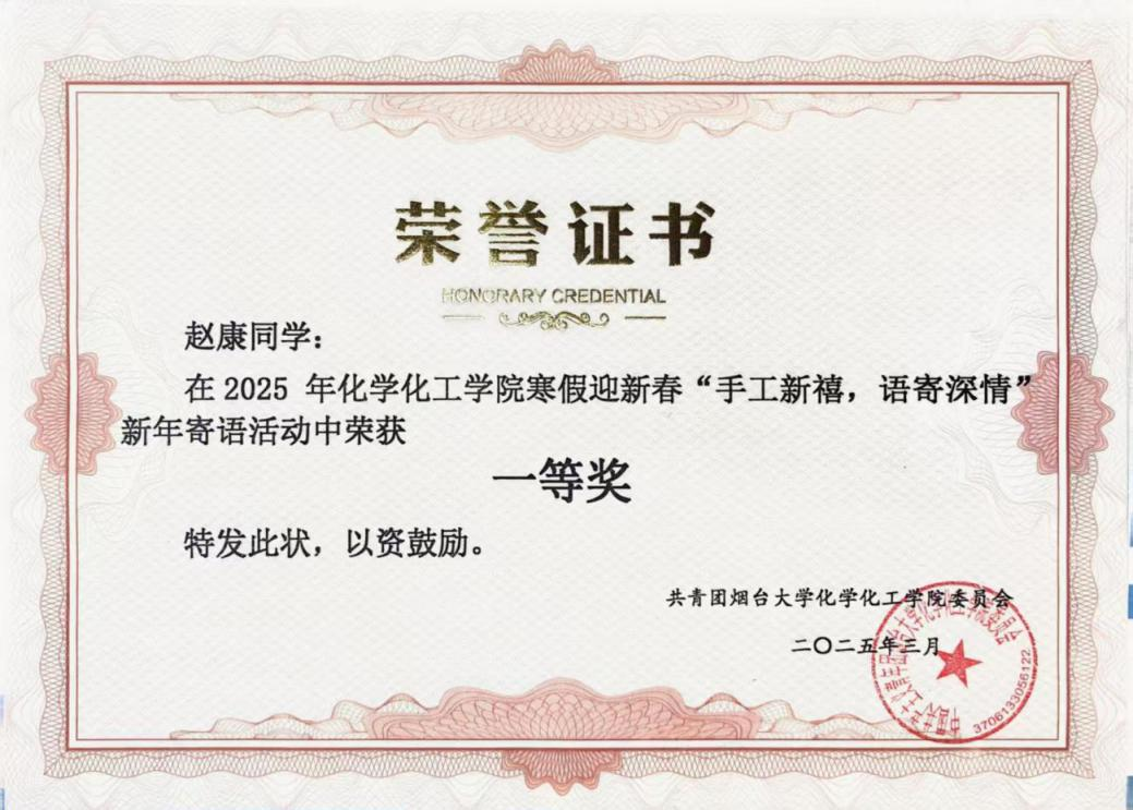 赵康,中共预备党员,化学化工学院应221-4班学生。学业成绩连续两学年专业第一、综测第二,身兼团支部书记、禁毒猎冰队队长等职。她斩获汉高奖学金、省化学实验大赛一等奖等多项荣誉,大一进实验室并以第二作者申发明专利,还带队开展近10次禁毒宣讲志愿活动。
