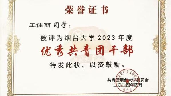 王佳丽,中共预备党员,化学化工学院化221-2班学生。在学习方面,她连续三年裸分和综测成绩均位于专业前列,曾获烟台大学“优秀学生奖学金”、“汉高奖学金”;在学生工作方面,她现任团支部科技委员,曾获烟台大学“优秀学生干部奖学金”以及“优秀共青团员”、“优秀共青团干部”称号;在科研竞赛方面,她先后参与多个科研项目和各类学科竞赛,曾获CATTI杯全国翻译大赛全国二等奖、第八届全国大学生化工实验大赛全国一等奖等奖项。